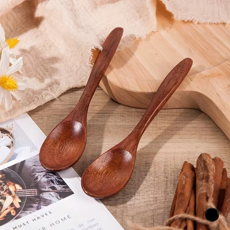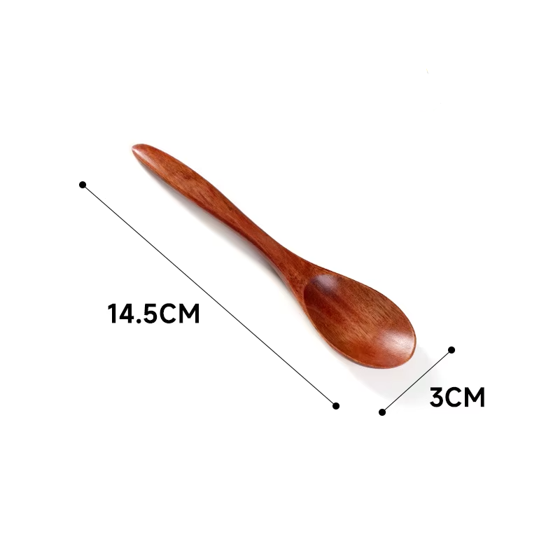 Each spoon measures approximately 14.5 × 3 cm, making them ideal for mugs, teacups, dessert bowls, or jars. The natural wood grain ensures that every spoon is unique, adding a rustic and eco-friendly touch to your tableware.