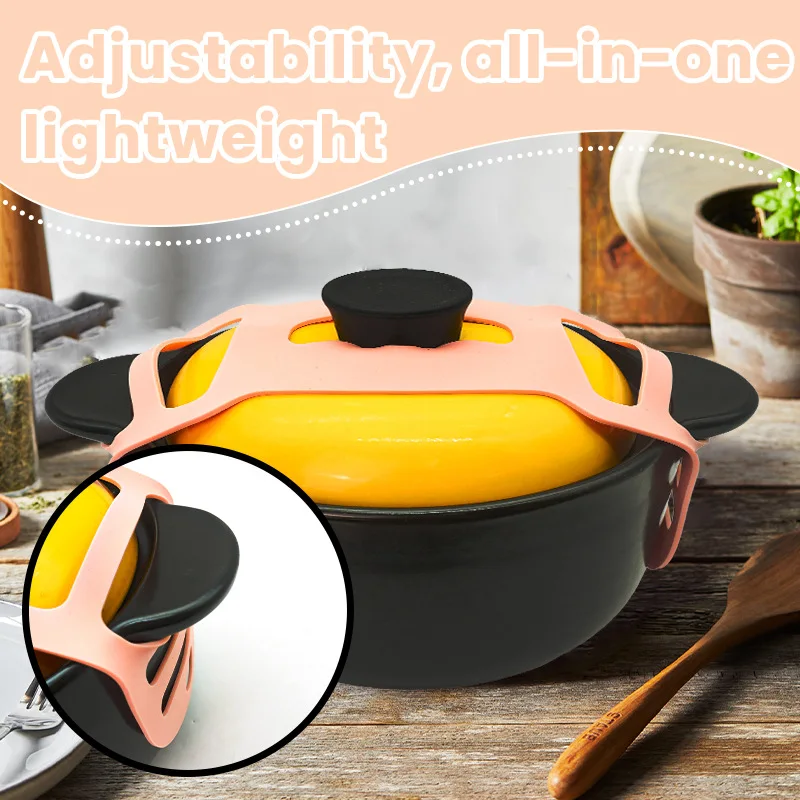Elastic rubber strap adapts to different cookware sizes for a secure fit.